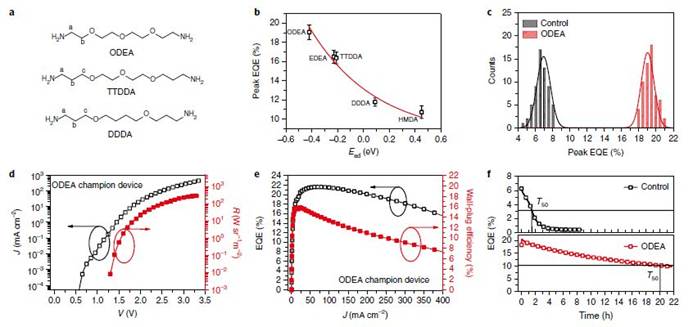 本论文提出钝化分子形成氢键与钝化效应的竞争机制,并通过理性分子设计,削弱氢键的限制作用,从而显著改善了钝化的效果并降低了钙钛矿薄膜中的非辐射损耗。实现了外量子效率达到21.6%的高效钙钛矿led器件,再次刷新世界纪录。