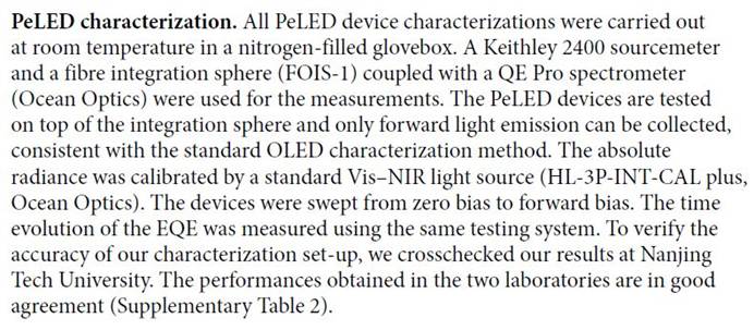 论文提到的测试方法中,使用了海洋光学荧光量子效率电致发光测试系统对peled进行特性表征测试: