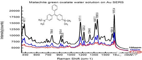 此次实验用便携式拉曼光谱仪accuman sr-510结合纳米au表面增强基底,实现了对于低浓度样品孔雀石绿和罗丹明b水溶液的检测,并在建立内标、外标或者统计模型后,可进行半定量的分析,很好的验证了方案的可实施型。
