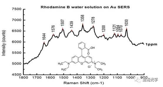 罗丹明b在溶液中有强烈的荧光, 可用于实验室中细胞荧光染色剂、有色玻璃、特色烟花爆竹等行业。罗丹明b会致癌,不允许用作食品染色。本次实验对1ppm浓度的罗丹明b溶液进行表面增强拉曼光谱检测。