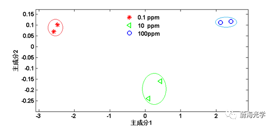 上图为测试数据的主成分分析的结果,可以看到不同浓度孔雀石绿样品被明显区分。