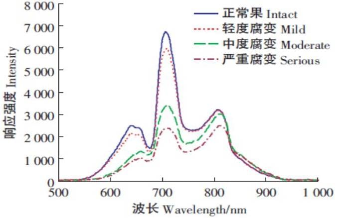 正常与不同腐变程度的苹果透射光谱比较图(可见 近红外)