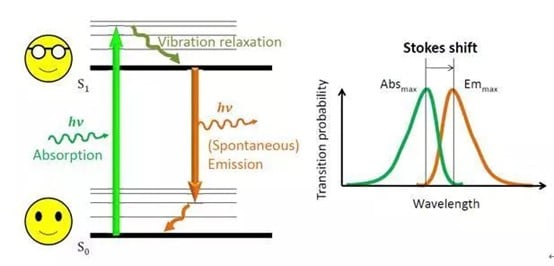 在量子力学理论中,这一过程可以描述为物质吸收光子跃迁到较高能级的激发态后返回低能态,同时放出光子的过程。光致荧光发光是多种形式的荧光(fluorescence)中的一种。