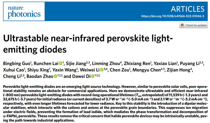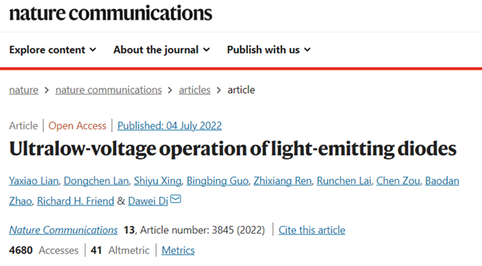 1. lian y , lan d , xing s , et al. ultralow-voltage operation of light-emitting diodes[j]. 2021.2. guo, b., lai, r., jiang, s. et al. ultrastable near-infrared perovskite light-emitting diodes. nat. photon. (2022). https://doi.org/10.1038/s41566-022-01046-33. https://mp.weixin.qq.com/s/s_vfnym4besl3wogh96n7q