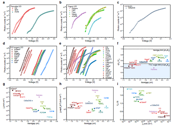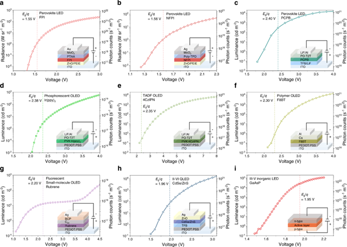 在这项工作中测试了17种不同类型的led,首先选择钙钛矿led,制备了以近红外发光的碘基材料fpi、nfpi以及绿色发光的溴基材料pcpb的钙钛矿led,这三种led的最低驱动电压分别是1.3v、1.3v及1.9v,led中光子的最高能量分别为1.55ev、1.56ev及2.4ev。这表明三种材料的led均可在低于带隙所限制的最小阈值电压下发光。接下来选择几种不同的oled、qled以及商业iii–v族半导体led,得到的结论与之前的相似。