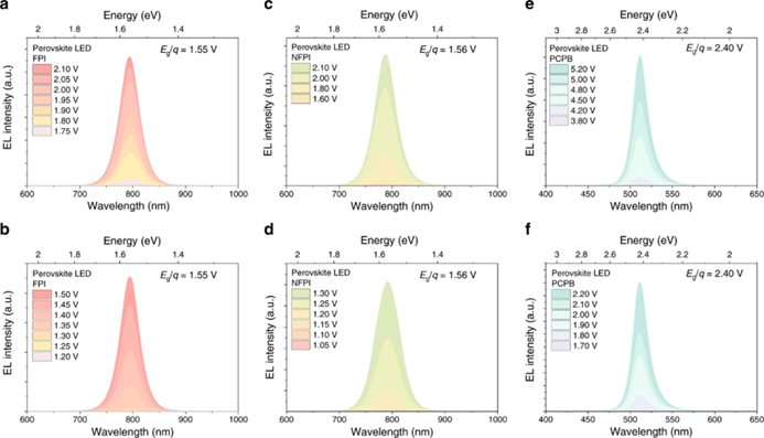 图2. 钙钛矿led在高于及低于带隙所限制阈值电压下的el光谱