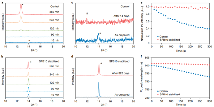 表1:经sfb10稳定的钙钛矿led寿命数据为了探索器件高稳定性的原因,作者研究了双极性分子sfb10对钙钛矿薄膜稳定性的影响。结果表明,双极性分子sfb10提高了钙钛矿薄膜的热稳定性、相稳定性与荧光稳定性。经sfb10稳定剂处理的钙钛矿样品在空气中放置322 天,仍然维持了具有良好光电活性的α相fapbi3钙钛矿,而对照组样品在14天内就发生了相变与降解。