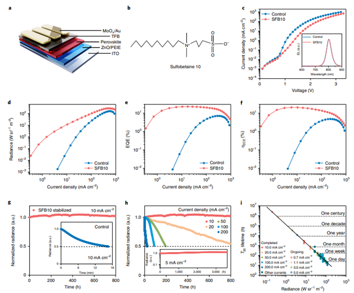 作者选取了在高性能太阳能电池与led均有应用的fapbi3钙钛矿作为基本研究对象,引入双极性分子sfb10,实现了高效和超稳定的近红外(~800 nm)钙钛矿led。器件峰值外量子效率(eqe)为22.8%,峰值能量转化效率(ece)为20.7%。这些钙钛矿led展现了优异的稳定性,在5 ma/cm2下连续运行超过3600h(5个月)没有观察到辐亮度衰减。据加速老化测试获得,在初始辐亮度(或电流密度)分别为0.21 w/sr/m2 (0.7 ma/cm2)时,预期t50工作寿命为2.4×106h (约270年)。