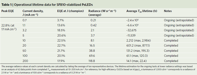 与钙钛矿太阳能电池类似,钙钛矿led的不稳定性是一重大难题。近年来,钙钛矿led在外量子效率(eqe)方面发展十分迅速,但其在连续工作条件下t50工作寿命(亮度降低到其初始值一半所需时间)一般在10到100小时量级,而实际应用需器件在高eqe、宽辐亮度范围下实现更长的工作寿命(高于10000小时)。