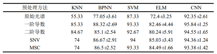 从上部烟叶样本训练集中随机抽取450个样本,按2:1比例分组,选择合适的预处理方法。实验随机重复五次,取平均值作为结果。发现与原始光谱比,预处理后的光谱鉴别准确度有所提高。