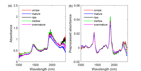 图2. 烟叶近红外光谱图(a)原始光谱,(b)预处理后光谱
