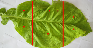 实验用海洋光学采集样本光谱,配件包含标准探头和漫反射白板,积分时间为5 ms,光谱范围为900-2500 nm,开机预热30 min,优化光谱仪扫描条件后进行近红外光谱扫描,扫描时每个样本在视线范围内避开主脉在左右两侧各取3个点扫描(见图1),所有点的平均值作为该烟叶的代表光谱。