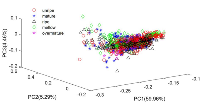 图3. 上部烟叶五个成熟度水平nir光谱方差的pca得分图