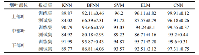 为对比cnn模型的性能,建立了knn、bpnn、svm和elm模型进行比较分析。证实了cnn模型在区分烟叶成熟度方面的出色分类能力。表2. cnn和其他四种方法的预测结果(%)