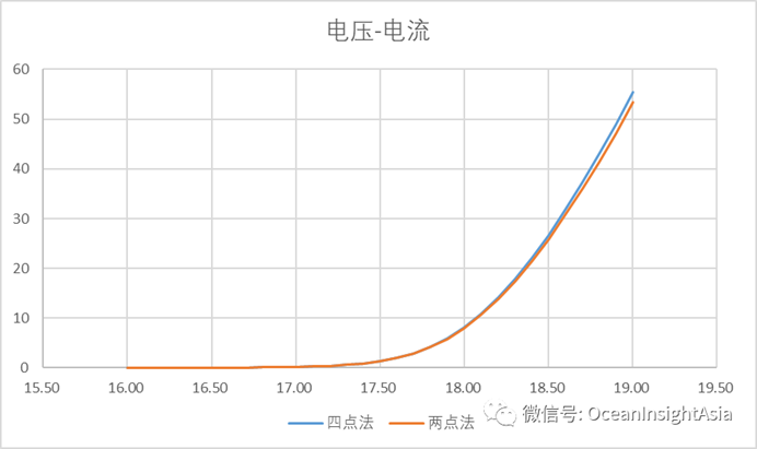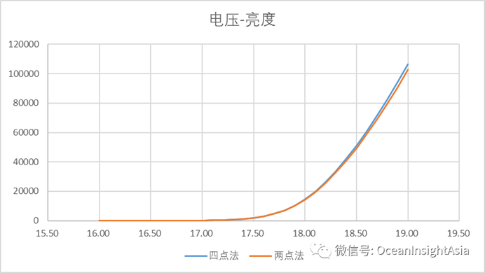 测试结果 为实际了解两点法和四点法的差别,我们将四根2m长的导线分别以两点法和四点法,在恒压模式通过电压扫描的方式,实际测试了同一个发光led的电流和亮度。