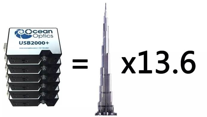 大家最熟悉的usb系列光谱仪,作为海洋光学的招牌产品,以性能优越,体积小巧,价格经济,使用灵活等优势深入人心,在全球已累计卖出超过25万台,虽然连起来的长度不能像某奶茶一样绕地球三圈,但是畧起来的高度也有13.6个哈利法塔、超过1.2个珠穆朗姆峰那么高了!