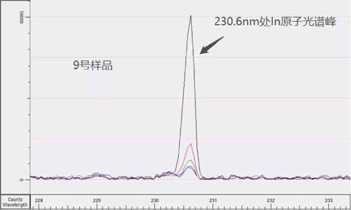 同c元素一样,我们分析了9号样品表面的疑似金属污染位置,并分析了激发光谱,通过软件进行快速元素辅助分析,在230.6nm处、325.6nm和325.85nm处,以及余下九处发现同一元素的原子谱线峰,通过对比标准原子光谱,我们发现这些谱线峰皆符合某种金属元素的标准原子发射谱线。且其变化趋势均为随着后续脉冲次数的增加而逐次减弱并消失。为了区分是否为表面污染物,我们并分析了样品基底的si元素峰,发现其强度均为由弱至强,而后每次激发强度变化较小。对比空白样品,并未发现在如上的9个波长位置有光谱发射峰。由此推断检测采样处的颗粒污染物为含某元素的金属颗粒。(注:光谱上同颜色的光谱显示的是同一次激发的结果)