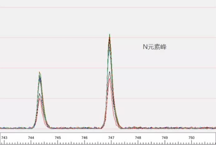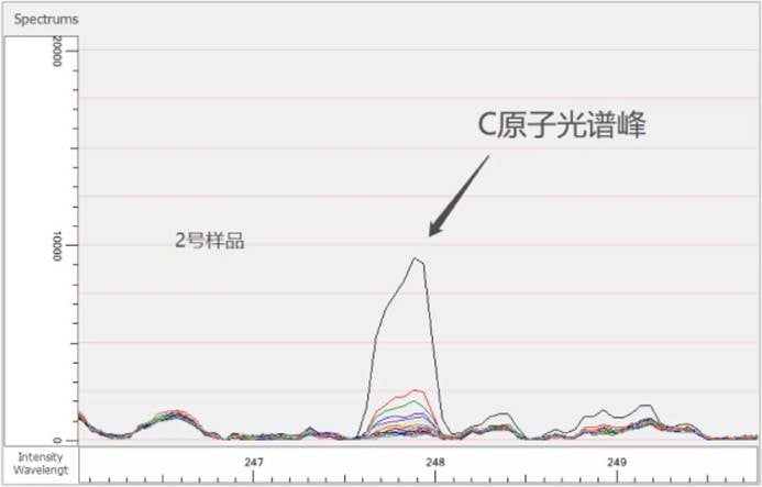 由于本次测试未安装气体扫吹系统,在进行测试时,空气中的元素会造成干扰,为了排除其影响,我们观察了o、n两种空气中常量元素的发射峰后,可发现元素峰强度随机波动且始终存在,因此可判定,247.85nm处的疑似c元素发射峰并非空气中的元素干扰。