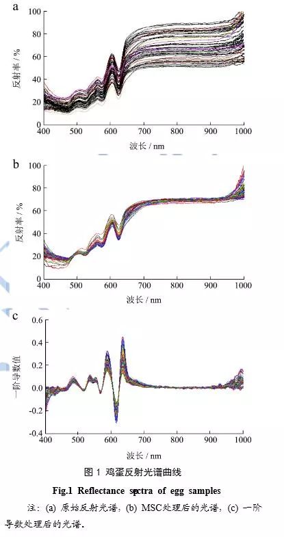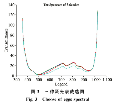 每24h采集一次鸡蛋,采集5天,总计采集235个鸡蛋;对比同一品种不同样品及不同品种的光谱建模,剔除了由蛋黄与蛋壳颜色造成的成本光谱差异,选取355-590nm及670-1025nm波段分析。建立算法模型,通过对光谱的判别分析,有效判别种蛋是否受精,准确率达87.18%。