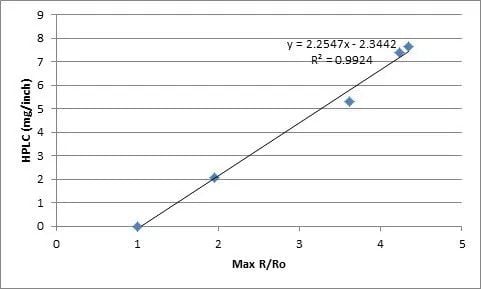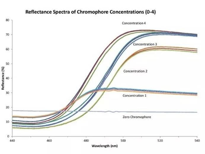 取各浓度谱的平均值,然后除以透明参考样品光谱,得到每种浓度的平均相对反射率。相对于hplc浓度数据绘制的这些值,显示r2相关系数为0.9924(图4)。海洋光学光学传感器的相对反射率与hplc确定的浓度之间的这种惊人的相关性,使客户能够将这种设置使用到他们的实时质量控制过程中。
