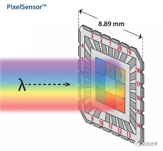 相对于传统的切换式滤光器,多光谱传感器具有明显的空间优势。其紧凑的尺寸可以同时检测多个波长带的光,并能有效降低成本。每个单独的传感器元件可直接过滤掉不用的波段,只检测特定的波段,也无需使用带通和二向色滤波器对波长进行分离,从而节省了大量空间。通过对传感器元件组合搭配,可以同时对多个不同频带进行分析。pixelsensortm将带通滤波器直接镀在每个光电二极管的表面,构建出效率更高,更坚固的传感器。