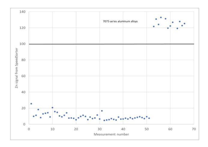 下图展示展示了另一种高效分选方案。利用7075合金很强的锌元素信号,可将其与其他合金清晰区分开来。由于信号强度差异非常明显,这种二元分选方式能够稳定产出高纯度的7075合金。