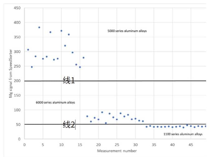 下图展示了5xxx、6xxx及1100系列合金的光谱信号比值。结果显示,镁含量高的5xxx系列信号与6xxx系列差异显著,通过设定的阈值线1即可实现高纯度分选。若需进一步区分镁含量有着细微差异的6xxx与1100合金,可通过设定的阈值线2进行分选,但需注意,由于这两类合金的信号差异较小,分选纯度会稍微降低。