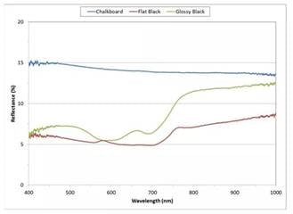 图4中显示的漫反射率数据,我们看到:无光和有光黑色涂料实际上在可见光谱区很类似,这意味着:在眼睛可见颜色区域两者非常类似,即使一个涂料反射了较多的光也是这样。涂料样品在近红外区开始不同,这表明:无论给予的涂料是什么,它的光泽表明可能都是一个近红外反射化合物。黑板涂料的漫反射率似乎比其他黑色涂料更高。但是,当在45°角度照明和观察的时候,反射探头不是在完全显示整个画面,仅是漫反射率。