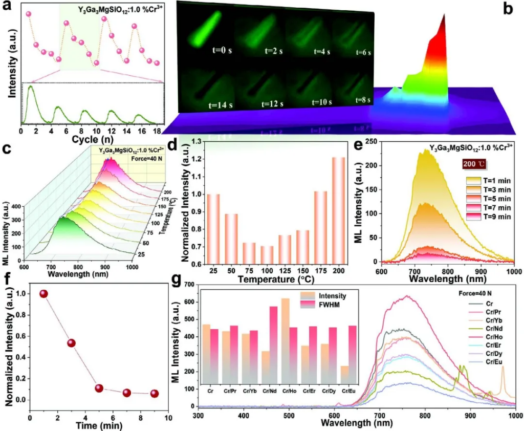 图1c 展示了ml光谱随时间和应力变化的3d图,揭示了ml信号与持久发光(persl)信号在时间上的分离。在0-240秒,persl逐渐衰减(噪声背景),而当施加应力时,ml信号瞬间产生且强度显著高于背景。直观证明了该材料具有高信噪比(snr),解决了传统ml材料中persl干扰严重的关键难题。