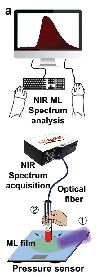 y3ga3mgsio12:cr3 材料凭借其优异的宽带ml特性(600-1000 nm),为近红外光谱无创检测技术提供了极具潜力的ag贵宾会的解决方案。基于此,研究人员首次构建了利用制备的nir-ml薄膜作为光源,对血液中血糖及血脂含量进行非侵入式分析的新型检测技术(图3)。在实验设计中,通过装载不同血液样品的玻璃试管对薄膜施加机械压力,诱导产生ml发射。随后,利用光谱仪精确采集近红外ml光穿透血液样品后的吸收光谱进行分析。
