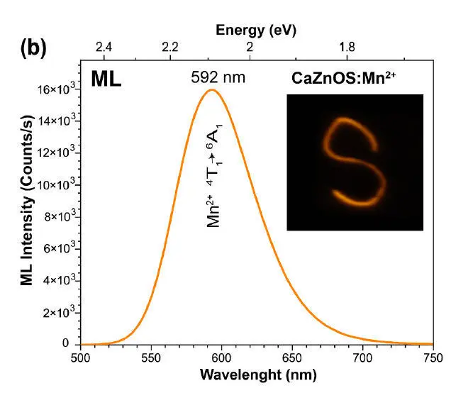 图4 展示了caznos:mn²⁺和baznos:mn²⁺材料在45 n压力下的ml发射光谱。结果表明,两个样品的ml发射峰均位于约592 nm处,两种材料的ml发光颜色一致(黄光)。谱图清晰地显示出,caznos:mn²⁺的ml发射强度是baznos:mn²⁺的32倍。这一巨大差异,是论证“晶体结构极性决定ml效率”的最直接证据。左图右上方的插图是一张在暗室中用手机拍摄的ml长曝光照片(书写“s”),只有caznos:mn²⁺能产生明亮可见的ml图案,而baznos:mn²⁺的信号已低于ml成像阈值。