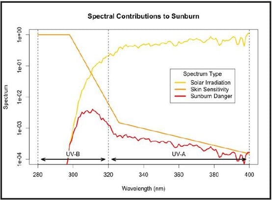 图1. 到达地球表面的太阳光谱,皮肤晒伤敏感度等信息。