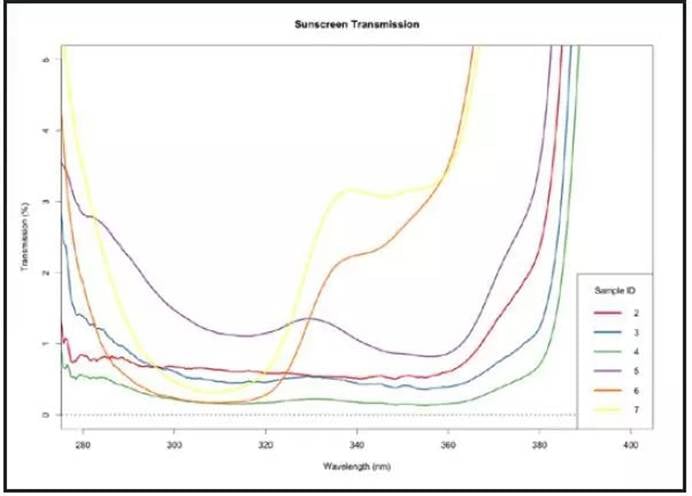 将薄层防晒霜样品固定到样品支架上,整个样品支架烘干60mins,并称重。烘干后的样品进行透射测试,获得的透射光谱作为100%的参考光谱,未烘干的防晒霜样品作为测量目标进行实际测量。下图2为不同样品的uv透射光谱。