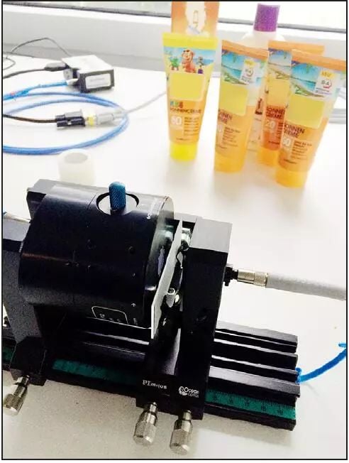 在使用光谱的方法测量spf之前,我们通过三种不同的方法对样品进行前处理。溶液法处理中,防晒霜中的有效成分会溶解在相应的溶剂中,然后通过标准的吸收测量装置进行透过率测试。然而,很多固体成分容易被该测量方法忽视掉。另外,防晒霜的薄膜可以通过见答案的沉积固定到透明支架上,从而可以测量防晒霜整体的透过吸收性能。因此我们现实中发现很难对防晒霜进行薄膜前处理和测试。