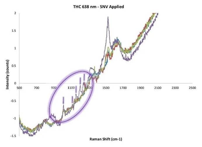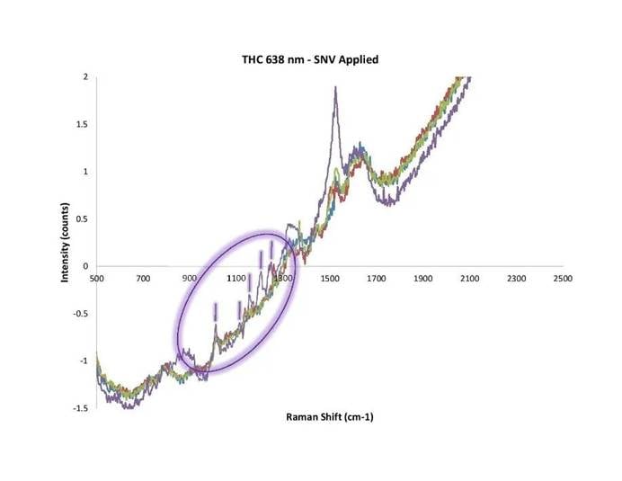 在本例中,sers被用来测量thc。注意原始光谱和标准化(snv)光谱的区别。