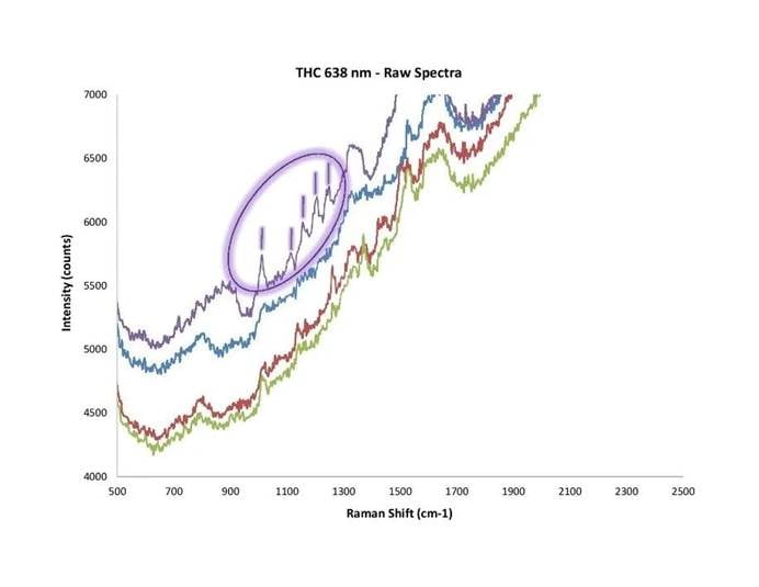 如图所示,使用表面增强拉曼光谱(sers)测量四氢大麻酚。在1100cm-1附近出现了5个拉曼峰;而在1500cm-1处明显的拉曼峰,并非来自样品,根据我们的实验经验,这个拉曼峰来自溶剂或柠檬酸盐(用于sers基质)。