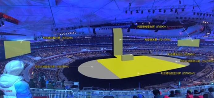 北京冬奥的地屏总面积10552平米,由4万多块50×50cm的led模块组成,分别由利亚德、京东方和洲明科技承制。
