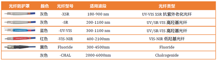 不同的波段范围对应不同的纤芯材料,海洋光学的光纤波段可覆盖总范围为180-6000 nm。下图为海洋光学光纤及适用波段范围对照表。