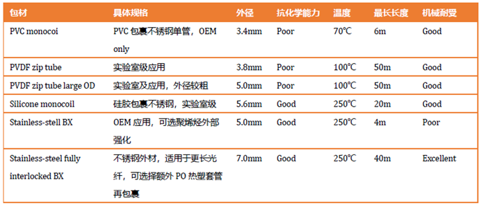 外包材对光纤主要起保护作用,在实际应用中,我们需要根据不同的测试环境来选择不同的光纤外包材料。海洋光学光纤外包材有硅胶、pvc、不锈钢等材质可定制选择。