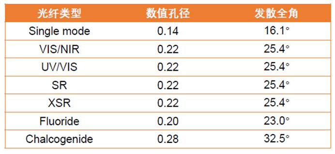 海洋光学大多数光纤的数值孔径na都为0.22(如下表所示),若光纤处于真空或空气中,光纤的发散半角即全反射角为αmax=12.7°(全角大约25.4°)。