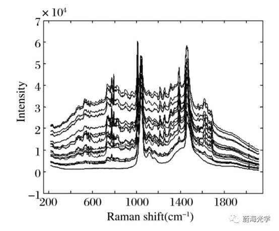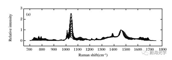 实验中光谱测量范围是0-2100cm-1,积分时间为25s,激光器中心波长是785nm,采样池尾10mm石英比色皿。样品放入比色皿后,激光通过激发光纤到达光纤探头,照射样品后产生拉曼信号,再经过光纤探头收集,经过收集光纤进入光谱仪,信号扣除暗背景后得到样本原始拉曼信号。