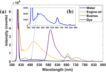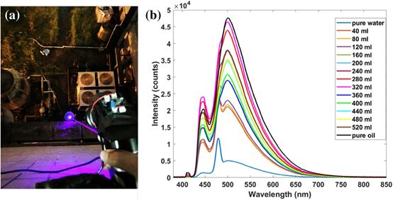 实验一:飞行完成后获取了本次飞行的光谱数据,光谱中共记录了四种典型的光谱数据,在两个浮式容器上的测量中观察到500nm处的油荧光和580nm处的染料特征峰。无人机扫描还覆盖了河边的灌木丛,记录到685nm和745nm处的强叶绿素峰,这是陆地植被的特征。自然珠江深水lif光谱在上图b中放大,水拉曼峰为480nm。