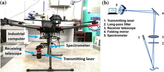 图1 a 带有荧光传感器系统的无人机;