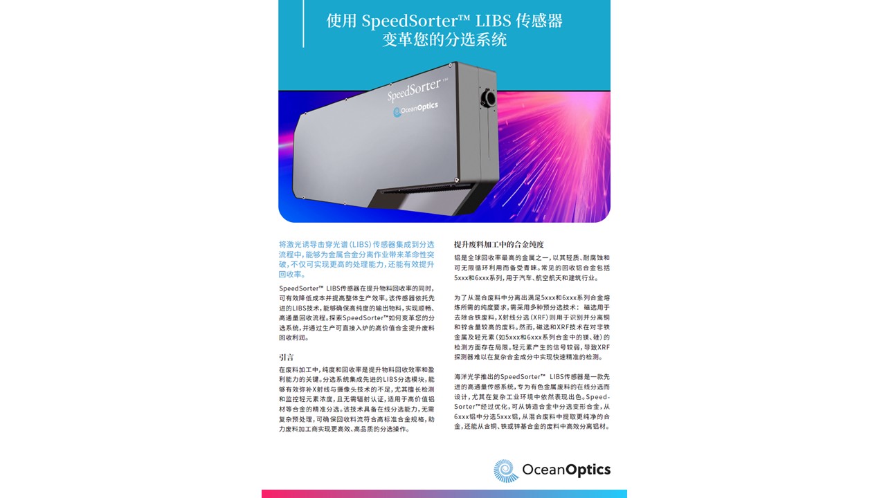 海洋光学speedsorter™ 是一款工业级、高吞吐量的传感系统,专为在严苛环境中进行在线有色金属废料分选而设计。 该系统基于激光诱导击穿光谱 (libs) 技术,可快速测定每块铝废料的化学成分,并将结果实时传输至分选系统。